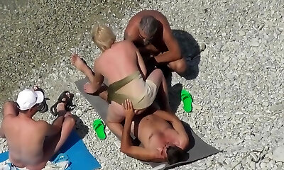zwei fkk-paare genießen in den nackten strand-beach hookup