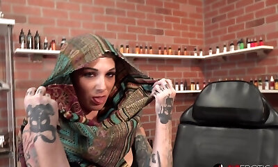Gorgeous Milf in tattoos with pierced tongue and nipple. Red-hot.