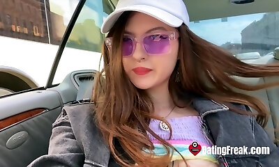 Tattooed busty emo girl Candy Doll is busy with jerking hard-on in the car